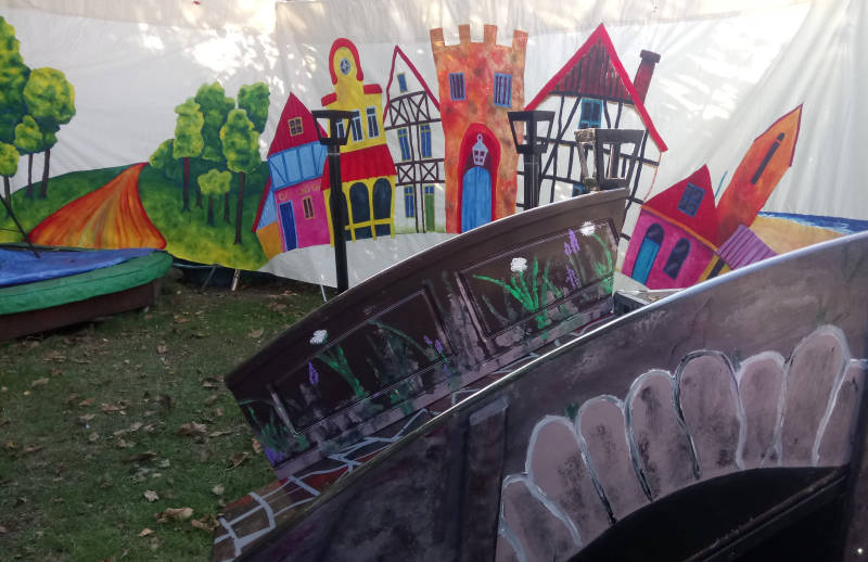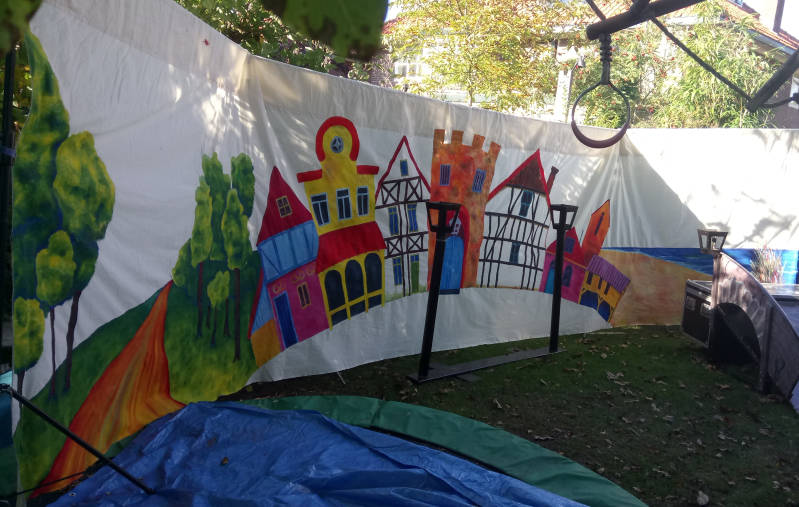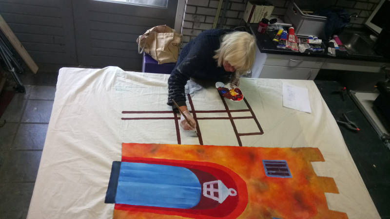 Hier is Marianne bezig met de huizen rond het marktplein van Hamelen. Nou ja Hamelen.......... Eigenlijk waren de gebouwen in Hamelen niet allemaal even geschikt voor ons achterdoek. Daarom staan er wat gebouwen tussen die we zagen in....... Enkhuizen.